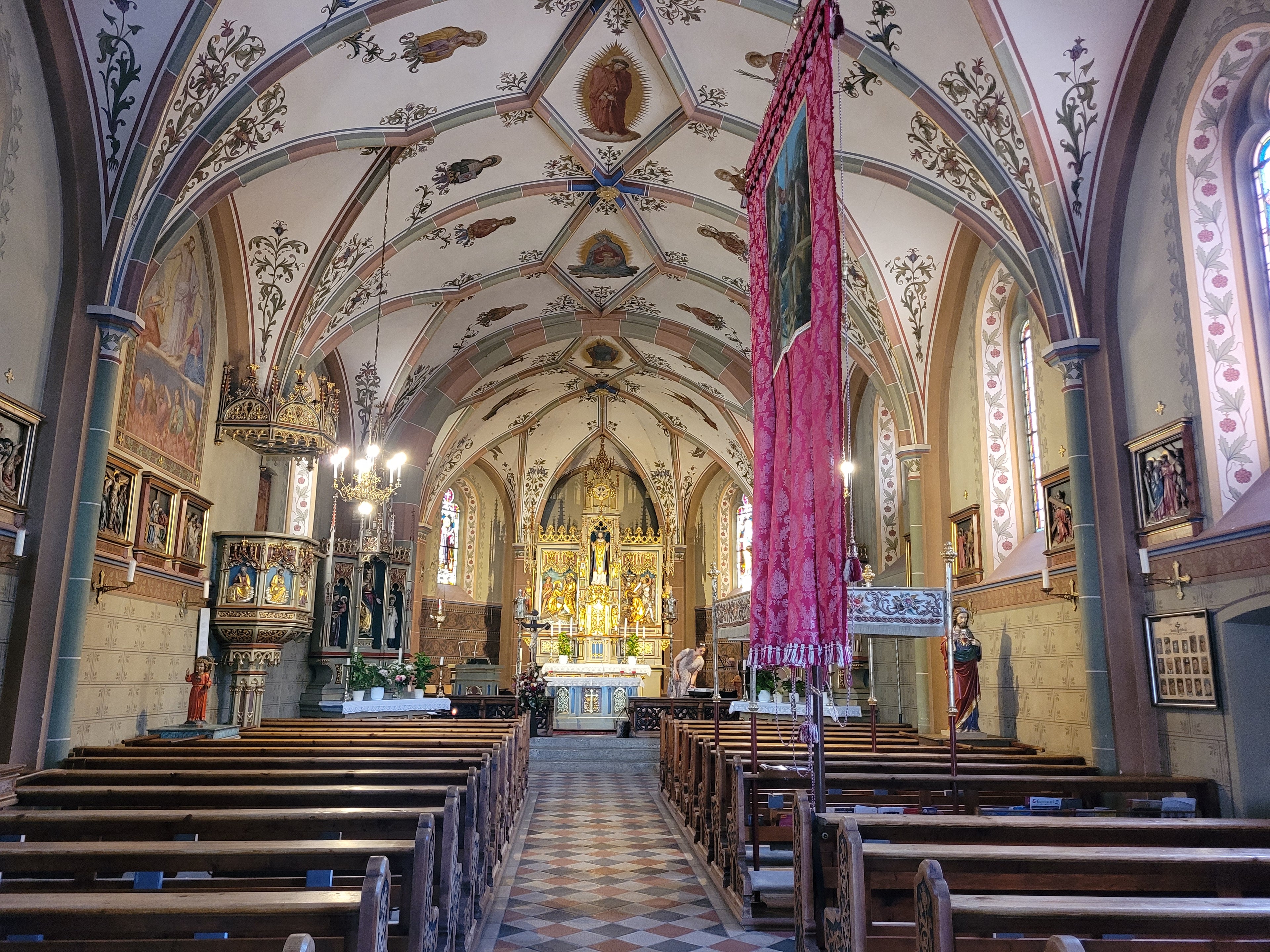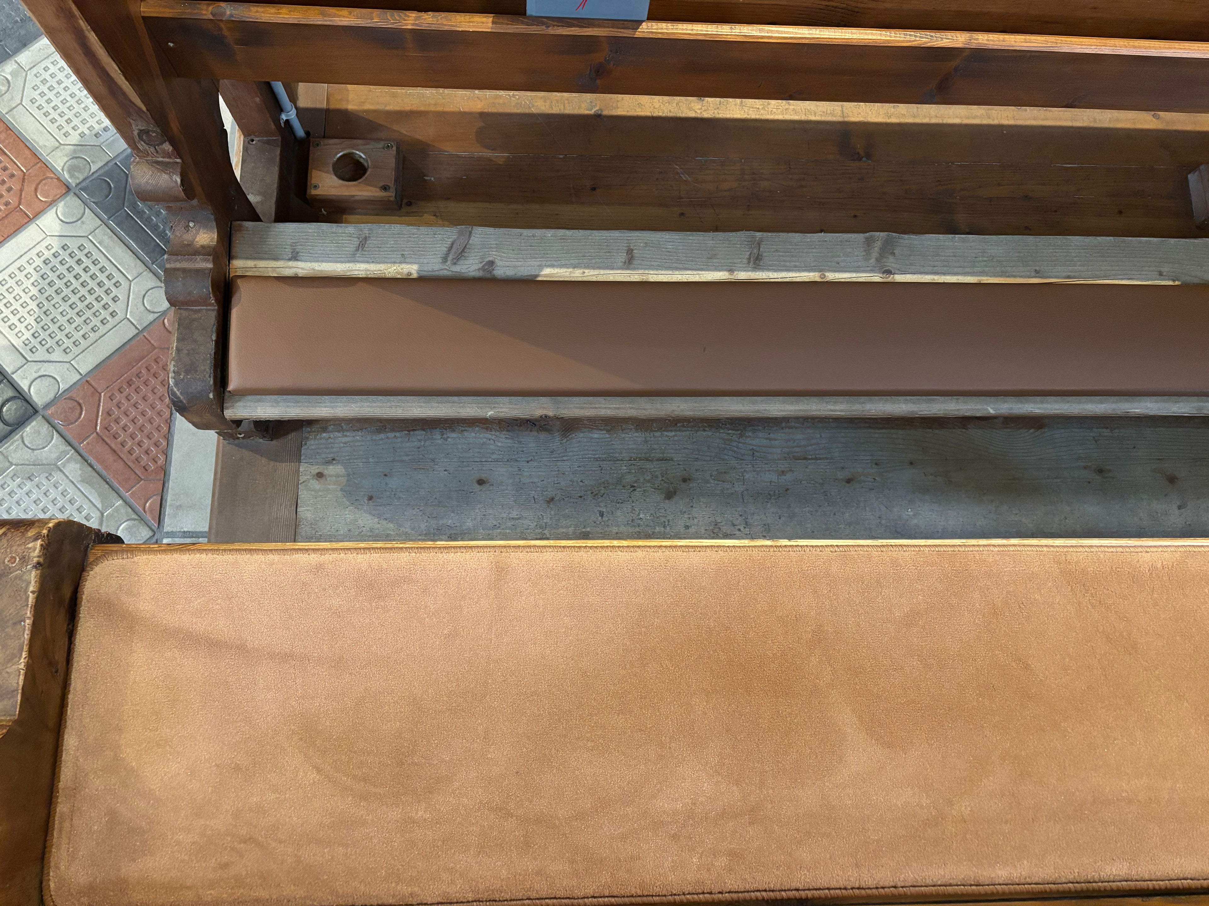 Die KIrche Kauns hat sich für braune Sitzbankauflagen in Velours Uni entschieden. Dazu passend die Kniebankauflagen aus Kunstleder für einfache Reinigung. Das Ergebnis kann sich sehen lassen. Die Farbkombination passt sich sehr gut dem Kircheninnenraum an.