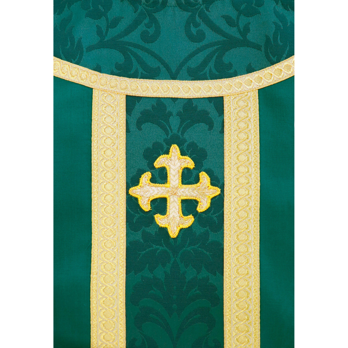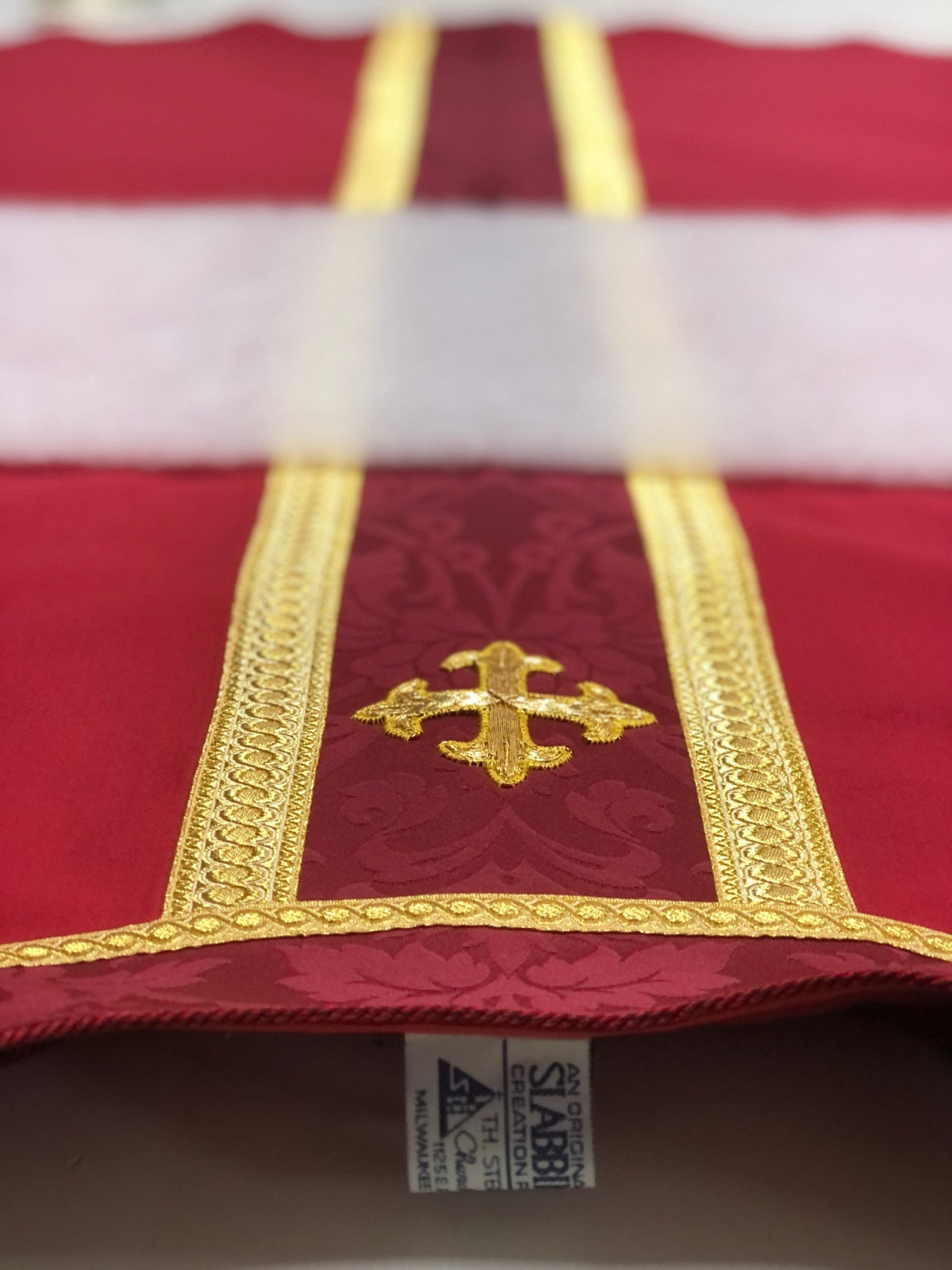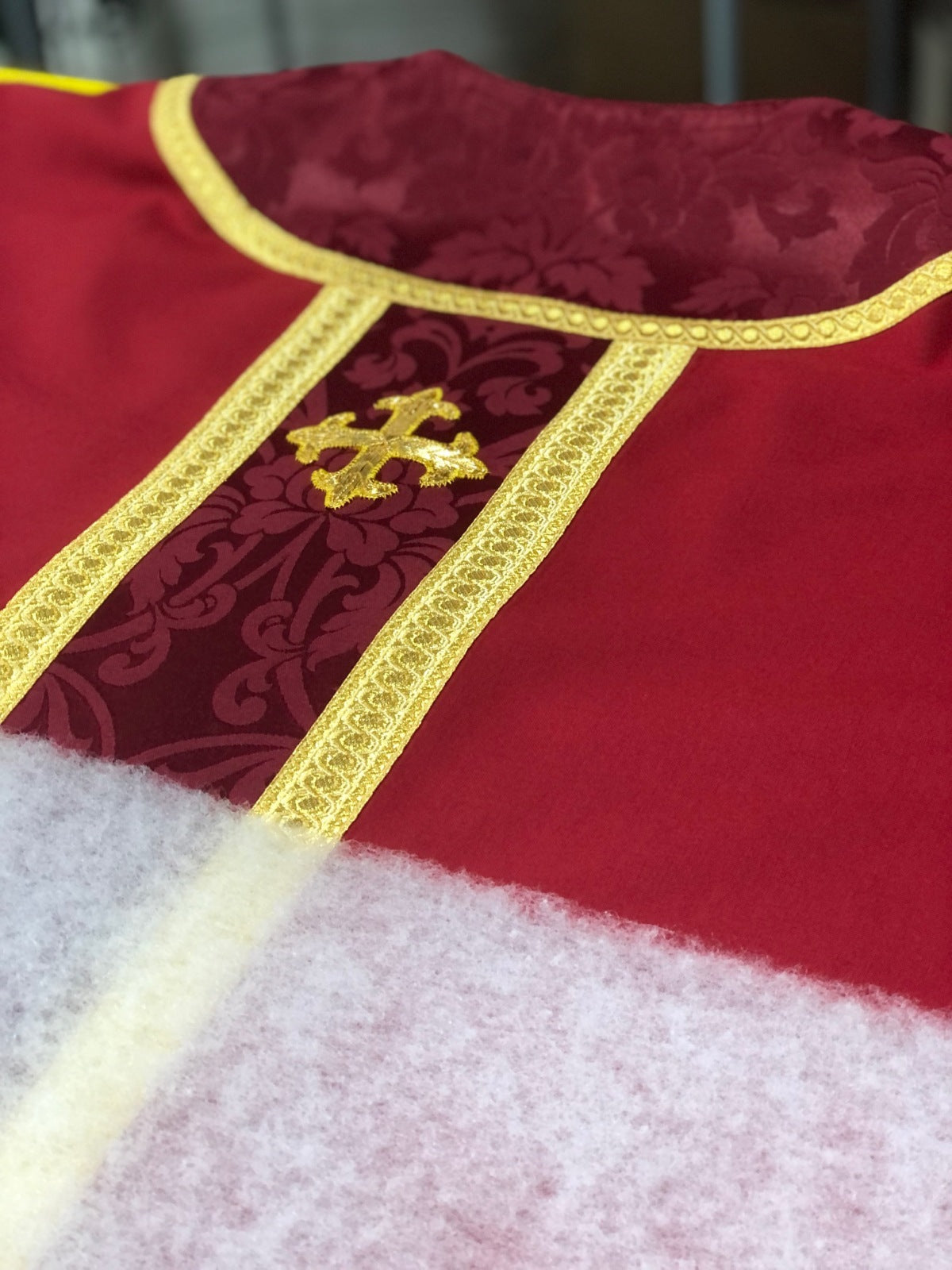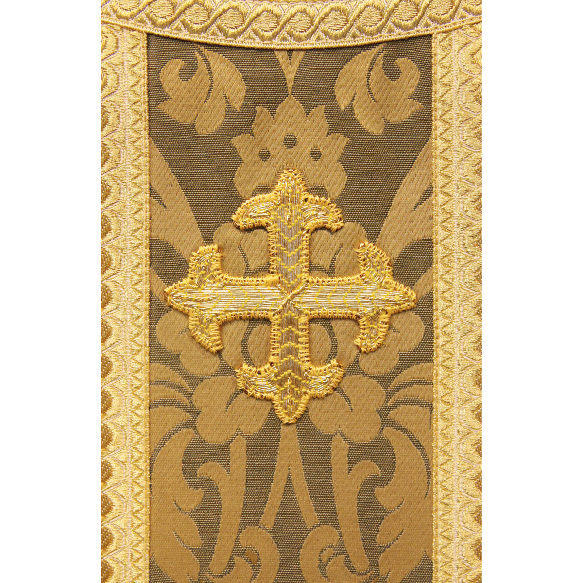 Handgestickte Kreuze auf Band in Goya, Damastgewebe, mit passender Goldborte eingefasst. Kragenpasse in Damastgewebe.
